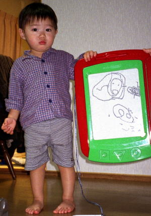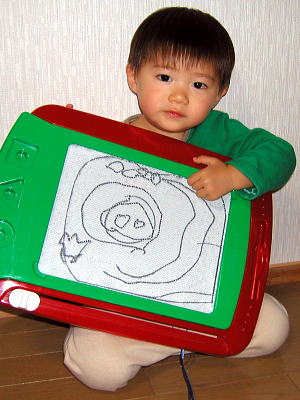 「くぅ」と「だーだ」力斗は創作意欲が高いので、絵を描いてもすぐに消したがります。不満そうな顔は、「写真撮るから消さないで!」と言われたため。 ちなみに実物は↓ ![]() ![]() |