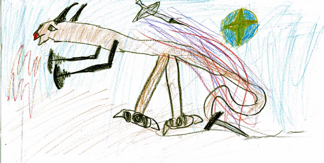 もう町は怪獣にはこわされたくないので、「地球防衛隊」を作りました。中に入ってチェックをしました。隊長が「中は完ペキです。」と言いました。次の日、空に何かが光っています。「何だろう」という声が聞こえます。光が青白くなり怪獣が出てまいりました。